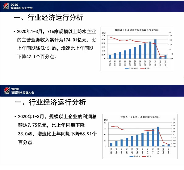 在會議現(xiàn)場,中國建筑防水協(xié)會秘書長朱冬青作出了關(guān)于《后疫情時期防水行業(yè)的挑戰(zhàn)和機(jī)遇》的主題演講,他從防水行業(yè)經(jīng)濟(jì)形勢分析、疫情對行業(yè)的影響分析和行業(yè)發(fā)展的挑戰(zhàn)與機(jī)遇等方面對主題演講進(jìn)行了專業(yè)解讀。朱冬青秘書長在演講中表示,今年一季度,受疫情影響,防水行業(yè)迎來了前所未有的收入及利潤雙下降,對行業(yè)發(fā)展帶來了不小的沖擊。